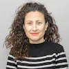 A person with short hair and glasses is wearing a blue sweater over a plaid shirt, standing against a plain gray background, embodying a professional and approachable style.