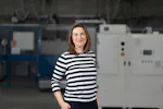 A professional woman with long blond hair is smiling confidently against a plain gray background, wearing a black blazer over a light-colored top, representing a technical project manager.